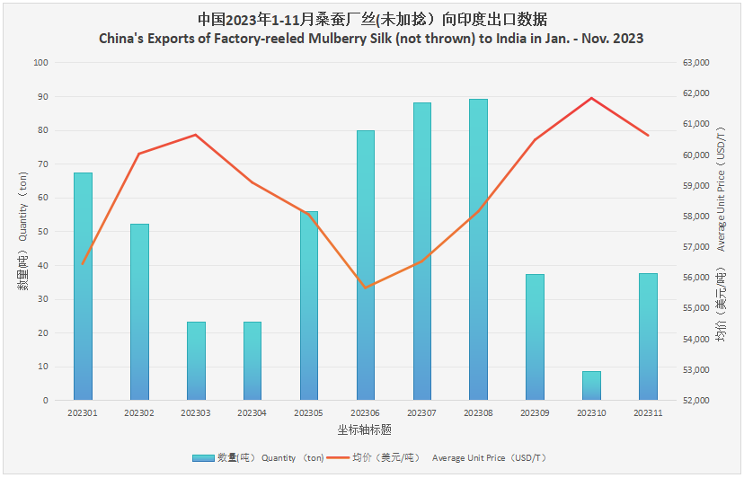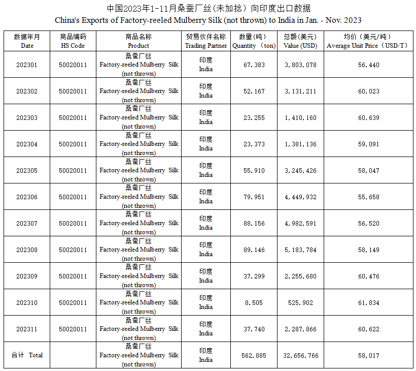 根據(jù)中國海關數(shù)據(jù),我國2023年1-11月桑蠶廠絲出口印度總額約為3265.6766萬美元,數(shù)量約為562.885噸。出口平均單價為5.8017萬美元/噸。數(shù)據(jù)僅為HS50020011項下出口統(tǒng)計,不包括整個絲類。
