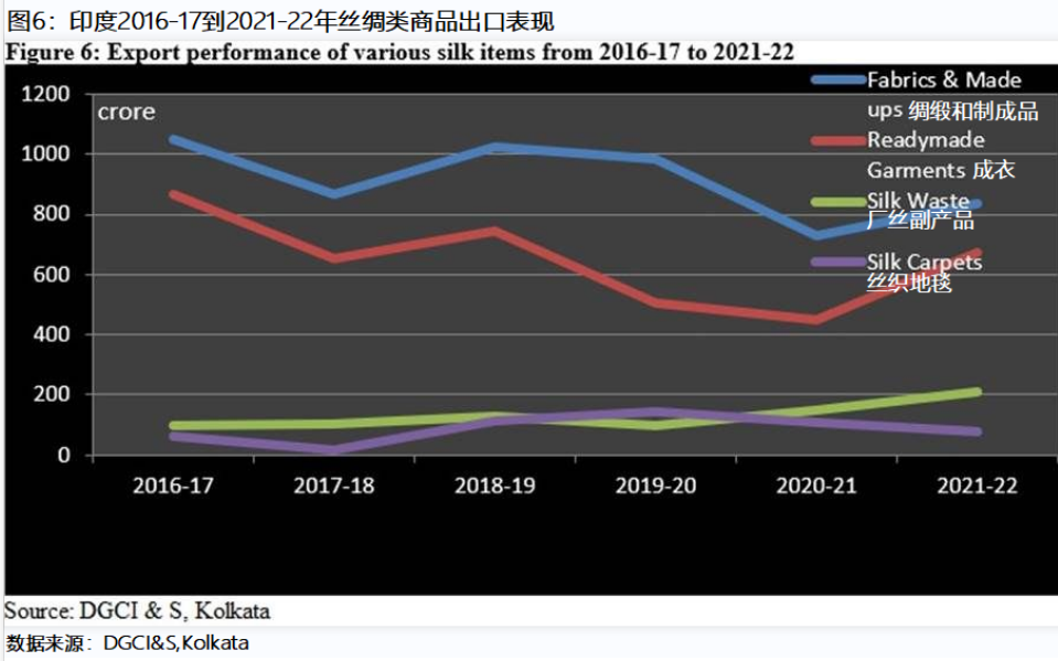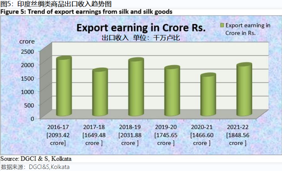 圖 5 顯示,與2020-21年相比,2021-22年印度絲綢出口額有所增加。然而,受疫情影響,2018-19年度至2020-21年度的出口額呈下降趨勢(shì)。