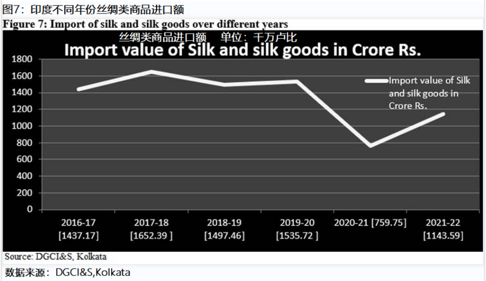從圖7可以看出,絲綢類商品的進(jìn)口額呈下降趨勢(shì)。2017-18年度,進(jìn)口總額超過160億盧比,2020-21年度降至80億盧比,這主要是由于疫情的影響。2021-22 年的進(jìn)口額達(dá)到110億盧比以上。