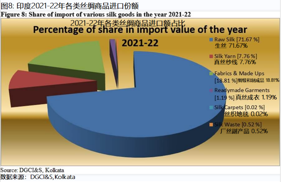 根據(jù)圖8,生絲是主要的進(jìn)口商品,在2021-22年度占比71.67%。綢緞和制成品的進(jìn)口額排名第二,占18.81%,其次是真絲紗線,占7.76%。其他進(jìn)口的絲綢制品是成衣、絲織地毯和廠絲副產(chǎn)品。