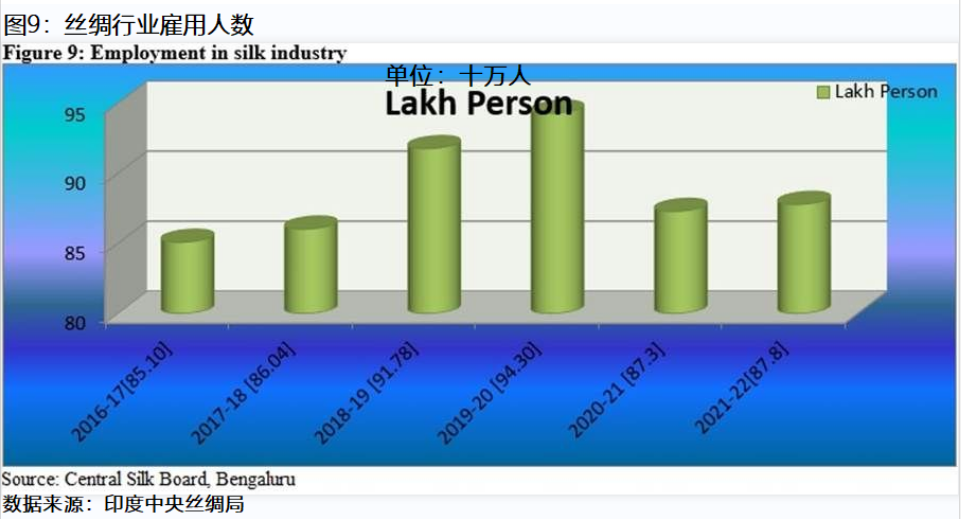 圖9顯示了2016-17至2021-22年絲綢行業(yè)的就業(yè)情況。在2016-17年度,有851萬人從事絲綢業(yè),而2021-22年為878萬人。在2019-20年度,從業(yè)人數(shù)最多,為943萬人。受疫情影響,2020-21年度絲綢業(yè)從業(yè)人數(shù)減少至873萬。