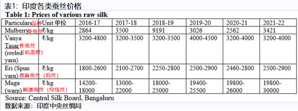 表1顯示2016-17年度至2021-22年度不同類型蠶絲的價(jià)格變化。2021-22年價(jià)格最高的姆珈蠶絲(經(jīng)線絲)的價(jià)格為每公斤19800盧比,比2016-17年上漲了66.6%。與 2016-17 年相比,2021-22 年桑蠶生絲價(jià)格上漲了15.95%,達(dá)到每公斤3421盧比。同樣,2021-22 年度蓖麻蠶絲(絹絲)的價(jià)格上漲至每公斤2900盧比,與2016-17年相比上漲了11.5%。