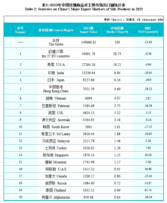 2023年,我國真絲綢商品進(jìn)出口總額為18.27億美元,同比下降11.1%,占我紡織品服裝進(jìn)出口總額的0.57%。其中,出口額為14.97億美元,同比下降11.5%,占我紡織品服裝出口額的0.50
