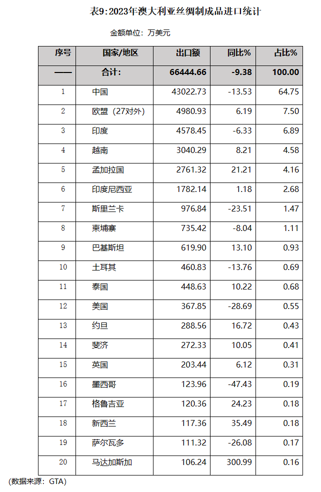 2021-2022年澳大利亞絲綢制成品進(jìn)口的快速增長(zhǎng)勢(shì)頭在2023年出現(xiàn)轉(zhuǎn)折,全年進(jìn)口額同比下降9.38%。自中國(guó)的進(jìn)口比重雖逐年下降,但仍占澳全部進(jìn)口的六成以上,遠(yuǎn)超其他進(jìn)口來(lái)源地。其他主要進(jìn)口來(lái)源中,自越南和孟加拉國(guó)的進(jìn)口保持較快增長(zhǎng)。(詳見表9)