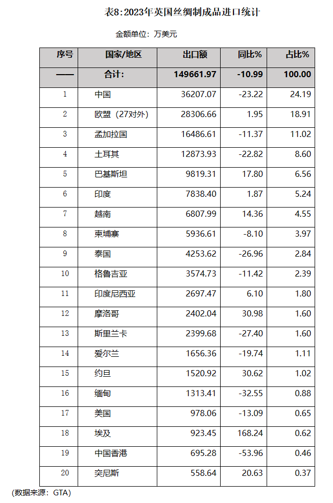 2023年英國(guó)絲綢制成品進(jìn)口由前兩年的快速增長(zhǎng)轉(zhuǎn)為下降。中國(guó)仍是其第一大進(jìn)口來(lái)源地,但進(jìn)口額同比降幅在主要來(lái)源中最高,達(dá)23.22%,所占份額有所下降。同樣降幅較大的還有土耳其和泰國(guó)。主要進(jìn)口來(lái)源中,自巴基斯坦和越南的進(jìn)口增幅最高。(詳見表8)
