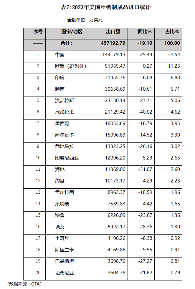 美國(guó)2023年絲綢制成品進(jìn)口出現(xiàn)較大幅度下降,主要進(jìn)口來(lái)源中,除自歐盟地區(qū)的進(jìn)口出現(xiàn)微幅增長(zhǎng)外,自其它主要來(lái)源進(jìn)口均出現(xiàn)不同幅度下降。其中自第一大進(jìn)口來(lái)源中國(guó)的進(jìn)口降幅達(dá)25.44%,其所占份額也有所減少。(詳見表7)