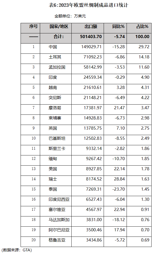 絲綢制成品出口額全球排名第三的土耳其2023年出口13.74億美元,同比增長(zhǎng)0.79%。歐盟是土耳其最主要的出口市場(chǎng),占比近六成,2023年土對(duì)歐盟的制成品出口未能延續(xù)前兩年的增長(zhǎng)趨勢(shì),出現(xiàn)小幅下降。
