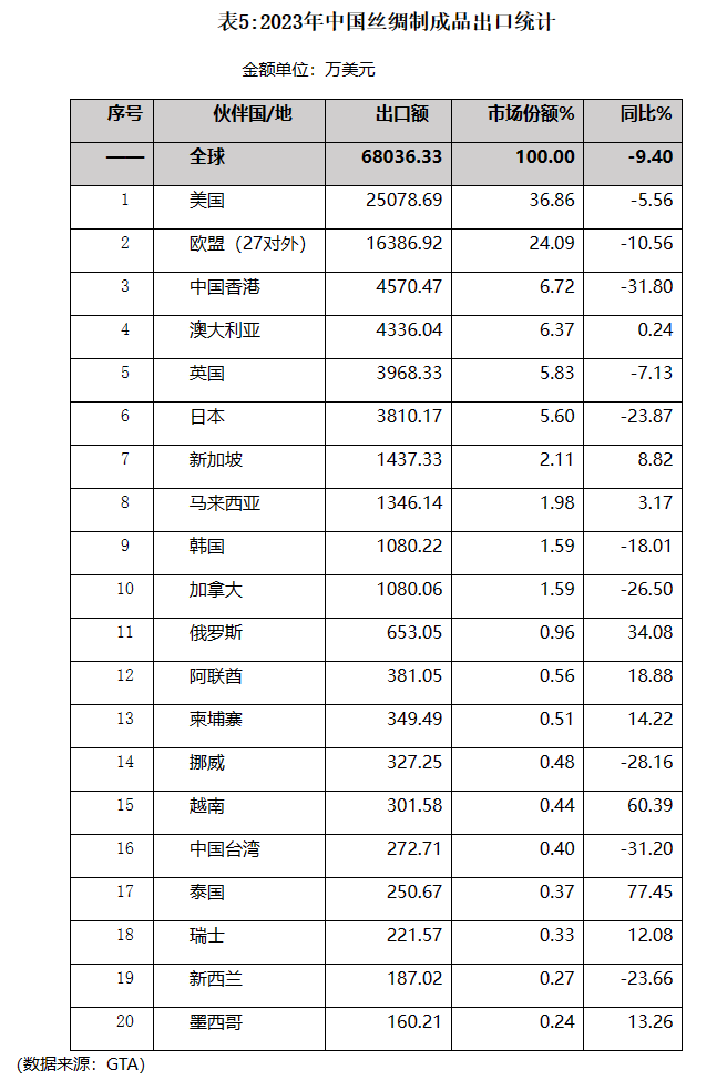 2023年中國(guó)絲綢制成品對(duì)傳統(tǒng)主要市場(chǎng)出口全面下降,對(duì)新興市場(chǎng)出口則有升有降。其中,對(duì)中國(guó)香港、日本和加拿大的出口降幅均超過(guò)了20%。如需更多中國(guó)絲綢貿(mào)易情況,請(qǐng)登陸紡織商會(huì)網(wǎng)站(www.ccct.org.cn)至絲綢分會(huì)欄目查詢。(詳見表5)
