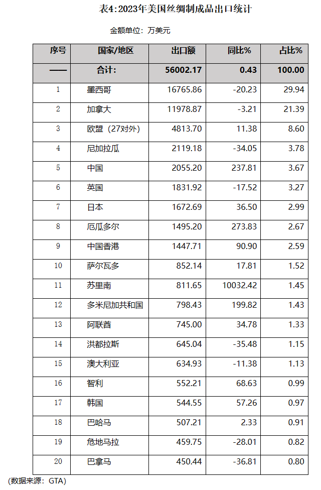 美國(guó)近五年絲綢制成品出口一直呈現(xiàn)增長(zhǎng)態(tài)勢(shì),2023年雖增速明顯放緩,但全年出口仍保持小幅增長(zhǎng)。墨西哥和加拿大是美最主要出口市場(chǎng),合計(jì)占比超五成,2023年對(duì)墨西哥的制成品出口出現(xiàn)較大下降,降幅達(dá)20.23%。2023年美國(guó)對(duì)中國(guó)絲綢制成品出口出現(xiàn)激增,中國(guó)的排位從2022年的第12位躍升至第5位,同樣出現(xiàn)出口激增的還有厄瓜多爾、蘇里南和多米尼加。(詳見表4)