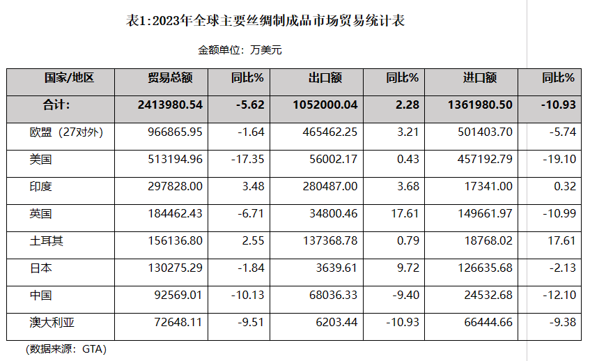 歐盟、美國(guó)、印度、土耳其、中國(guó)、日本、英國(guó)和澳大利亞是世界絲綢制成品貿(mào)易最重要的參與者,2023年7國(guó)和歐盟絲綢制成品貿(mào)易總額為241.40億美元,同比下降5.62%。其中出口額105.20億美元,同比增長(zhǎng)2.28%;進(jìn)口額136.20億美元,同比下降10.93%。(詳見表1)
