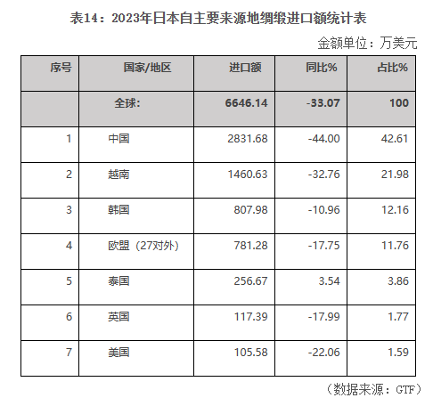 2023年,日本綢緞出口額為1.26億美元,同比下滑12.45%。