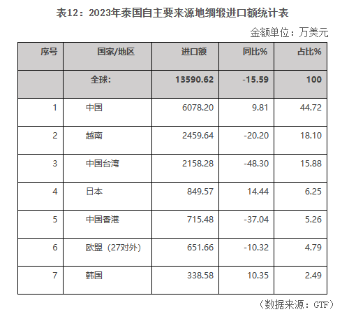 2023年,泰國綢緞進口額為1.36億美元,同比下降15.59%。