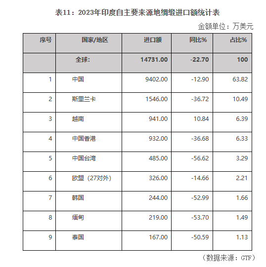 2023年,印度綢緞進口額為1.47億美元,同比下降22.7%。