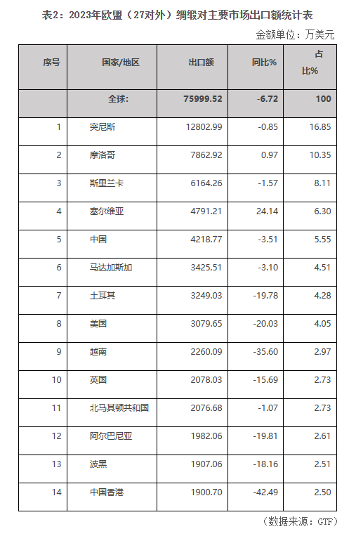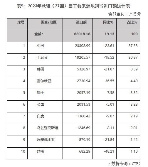 2023年,歐盟綢緞進口穩(wěn)居首位,進口額為6.20億美元,同比下降19.13%。