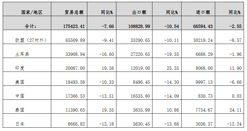 其中,印度、泰國貿(mào)易額分別增長19.58%和19.55%,其余4國和歐盟的貿(mào)易額呈現(xiàn)不同程度的下降。