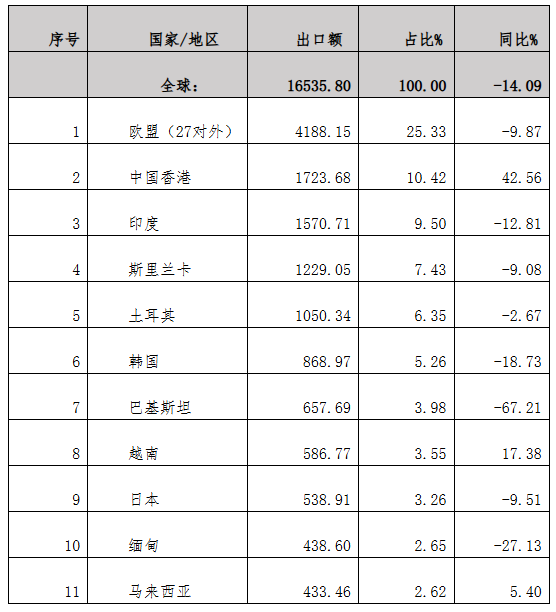 表2:2024年1-6月歐盟(27對外)綢緞對主要市場出口額統(tǒng)計表
