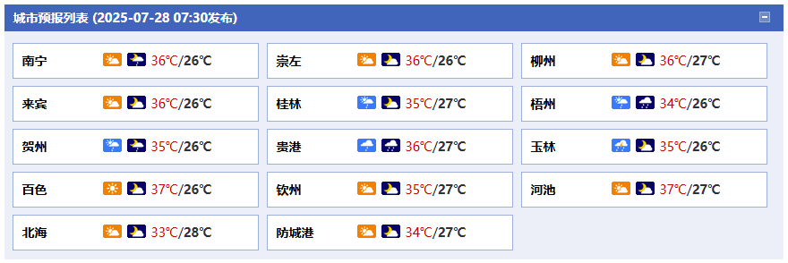 南寧市:今天白天多云、午后局地有陣雨或雷雨,今天晚上多云有陣雨,東北風(fēng)1~2級(jí),最高氣溫36℃,最低氣溫26℃。