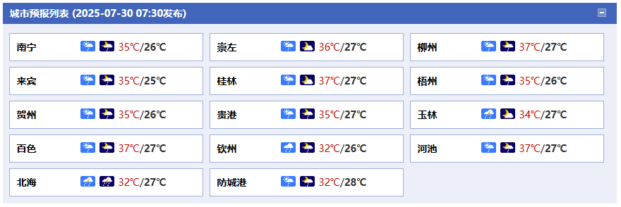 預(yù)計(jì)7月31日白天,廣西全區(qū)以多云為主,分散性陣雨或雷雨 “隨機(jī)打卡”。其中,玉林、梧州、賀州、貴港、來賓、北海、欽州、防城港、南寧、百色等市的局地有暴雨,還伴有短時(shí)雷暴大風(fēng)等強(qiáng)對(duì)流天氣。值得注意的是,受臺(tái)風(fēng) “竹節(jié)草” 外圍下沉氣流影響,即便雨水 “到訪”,廣西大部地區(qū)最高氣溫仍維持在35℃左右,高溫主要位于桂北、桂西,有34~36℃,局地超37℃;其他地區(qū) 31~34℃,局地可達(dá) 35℃以上,全區(qū)體感悶熱。昨天廣西氣象臺(tái)繼續(xù)發(fā)布高溫四級(jí)預(yù)警。