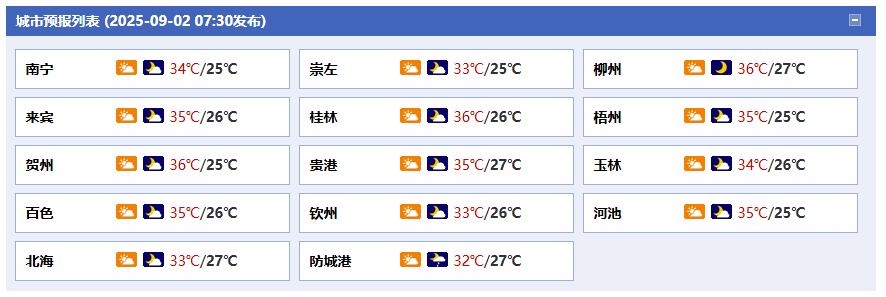 今天白天到晚上,全區(qū)多云到晴有分散陣雨或雷雨、局地大雨。桂東、桂北大部地區(qū)最高氣溫34~36℃、局地37℃以上,其它地區(qū)30~34℃。