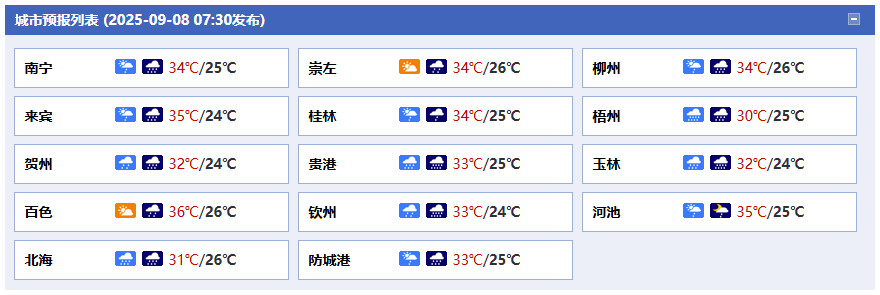 南寧市:今天白天多云有陣雨或雷雨,今天晚上大部有大雨、局地暴雨,偏北風2~3級,最高氣溫35℃,最低氣溫25℃。