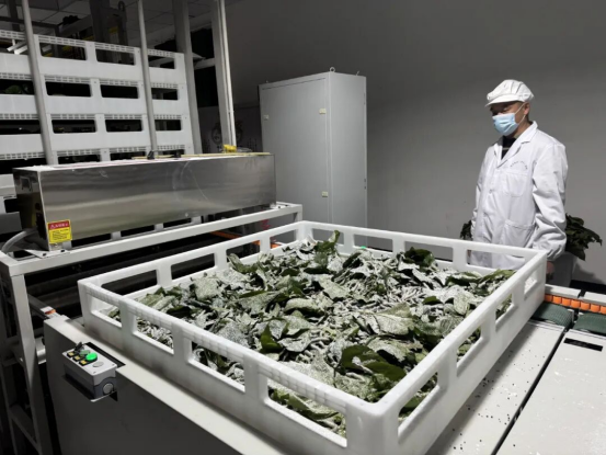 到了吐絲結繭的關鍵期,盡管熟蠶的食欲會下降,但每天三頓的喂食還是不能馬虎。李叢興操作起設備,其他工人只需配合將蠶盤和桑葉放進設備入口端,設置好參數(shù),傳輸帶便將定量的桑葉均勻地鋪放在蠶盤上,還會進行撒石灰粉等消毒程序?!懊刻扉g隔8小時喂食一次,此外,兩到三天還要除一次沙?!睆垙娜榻B,除沙就是給蠶“打掃房間”,把糞便、殘葉等清理出去。