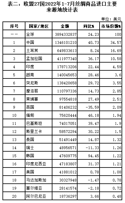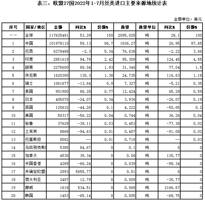 表三:歐盟27國(guó)2022年1-7月絲類進(jìn)口主要來(lái)源地統(tǒng)計(jì)表