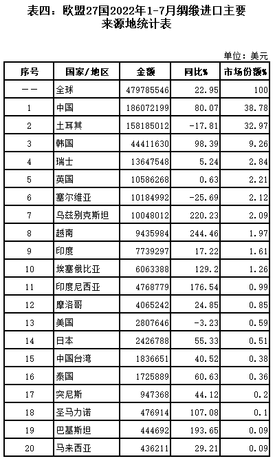 表四:歐盟27國(guó)2022年1-7月綢緞進(jìn)口主要來(lái)源地統(tǒng)計(jì)表