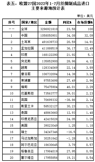 表五:歐盟27國(guó)2022年1-7月絲綢制成品進(jìn)口主要來(lái)源地統(tǒng)計(jì)表