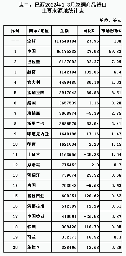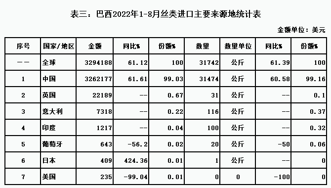 表三:巴西2022年1-8月絲類進(jìn)口主要來源地統(tǒng)計(jì)表