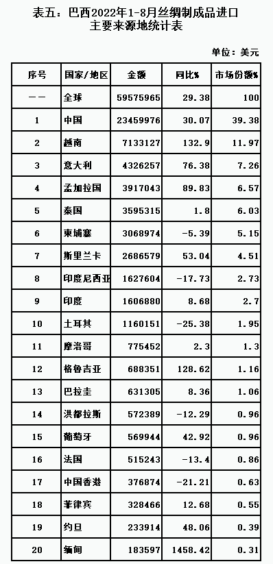 表五:巴西2022年1-8月絲綢制成品進(jìn)口主要來源地統(tǒng)計(jì)表