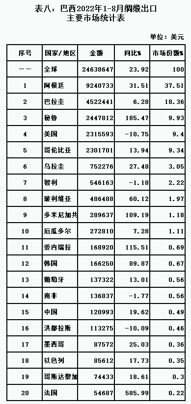 表八:巴西2022年1-8月綢緞出口主要市場統(tǒng)計(jì)表