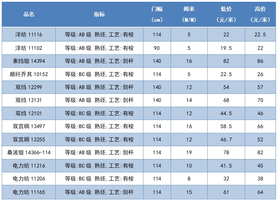 本周綢緞指數(shù)協(xié)作單位成交價格區(qū)間