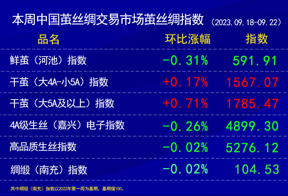高品質(zhì)生絲指數(shù)上,根據(jù)市場高品質(zhì)生絲協(xié)作單位本周所報,成交環(huán)比上周有下降,成交價格變化不大,部分有一些還價空間。整體高品質(zhì)生絲指數(shù)略下跌0.02%基本收平。