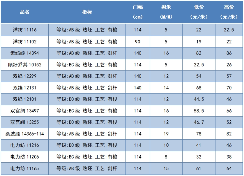 本周綢緞指數(shù)協(xié)作單位成交價(jià)格區(qū)間