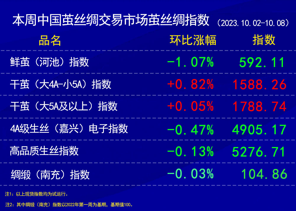 本周涉及長假,又是秋繭集中上市期,繅絲企業(yè)和織造企業(yè)買賣觀望行為也都有所增加,兩方面因素造成市場協(xié)作單位所報(bào)成交量比節(jié)前減少,成交主體內(nèi)的價(jià)格相差不大。本周高品質(zhì)生絲指數(shù)環(huán)比上周略收綠基本持平。