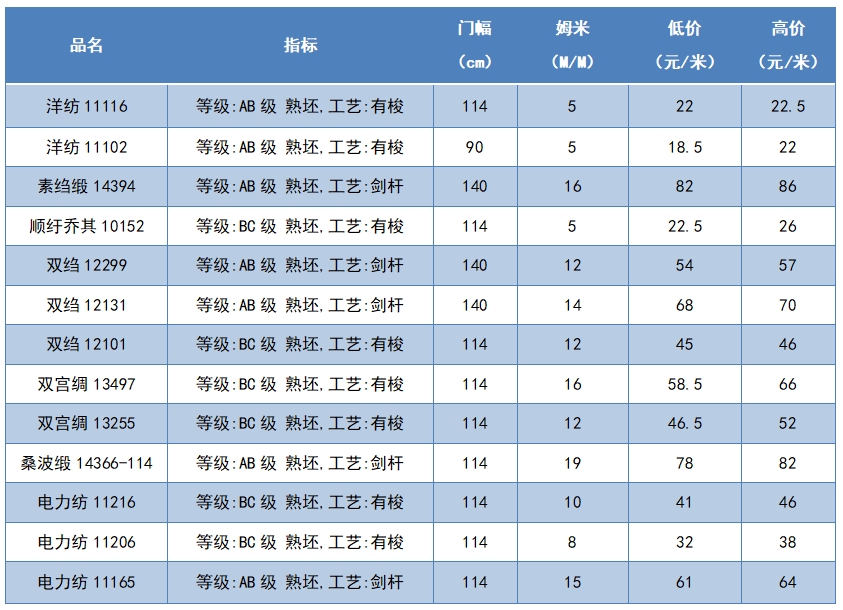 本周綢緞指數(shù)協(xié)作單位成交價(jià)格區(qū)間