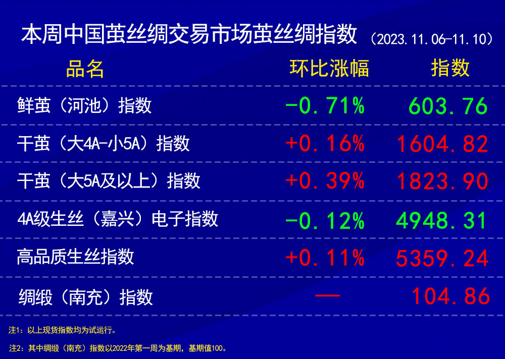 高品質(zhì)生絲指數(shù)上,根據(jù)協(xié)作單位所報(bào),本周成交環(huán)比上周下降,成交中,價(jià)格差距較上周有所拉大。價(jià)格指數(shù)環(huán)比上周略收紅。