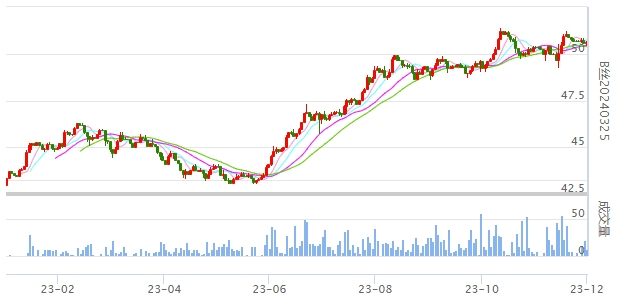 今日(2023年12月01日,周五)中國(guó)繭絲綢交易市場(chǎng)生絲指數(shù)微跌0.01%收于4974.61點(diǎn),本周生絲指數(shù)微跌0.02%。B絲(商檢4A級(jí)生絲):231225合約下跌0.06萬(wàn)元報(bào)收于49.77萬(wàn)元;240325合約上漲0.06萬(wàn)元報(bào)收于50.61萬(wàn)元;240925合約上漲0.06萬(wàn)元報(bào)收于49.17萬(wàn)元。