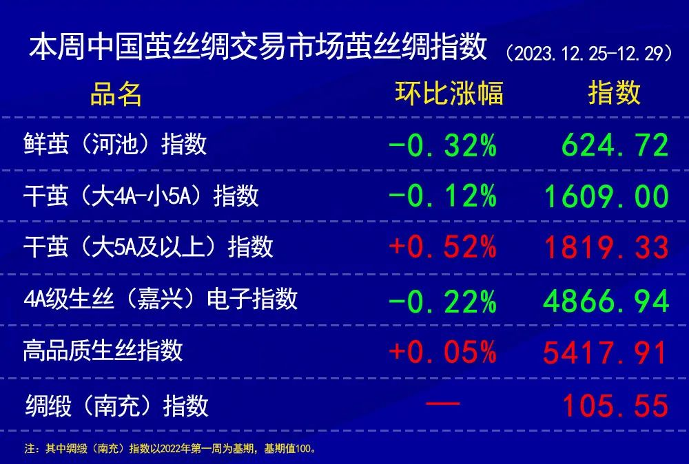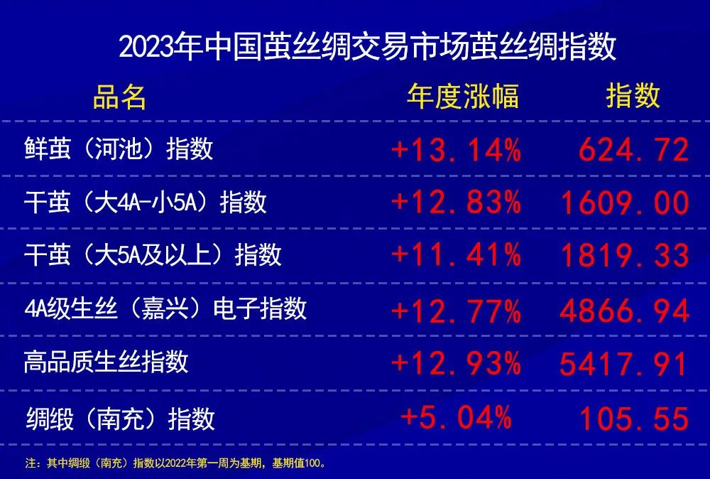 2023年,4A級生絲電子指數(shù)今年漲幅為12.77%。從供應鏈上的繭絲綢各環(huán)節(jié)的現(xiàn)貨指數(shù)來看,鮮繭指數(shù)今年漲幅為13.14%;兩個等級的蠶繭指數(shù)漲幅分別為12.83%和11.41%;高品質(zhì)生絲指數(shù)漲幅為12.93%;綢緞指數(shù)今年漲幅為5.04%。