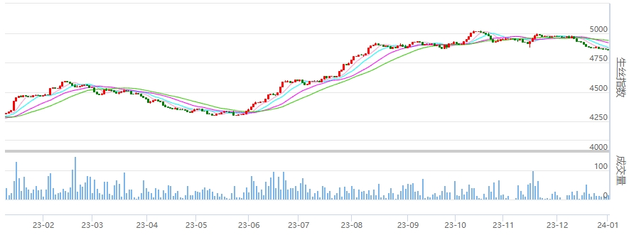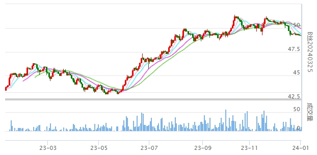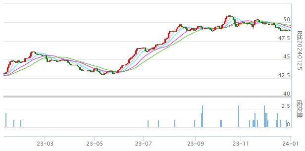 今日(2024年1月2日,周二)中國繭絲綢交易市場生絲指數(shù)微跌0.1%收于4861.97點。B絲(商檢4A級生絲):240125合約微跌0.03萬元收于48.87萬元;240325合約報平收于49.26萬元;240925合約微跌0.09萬元報收于48萬元。