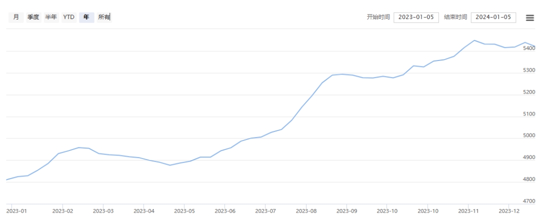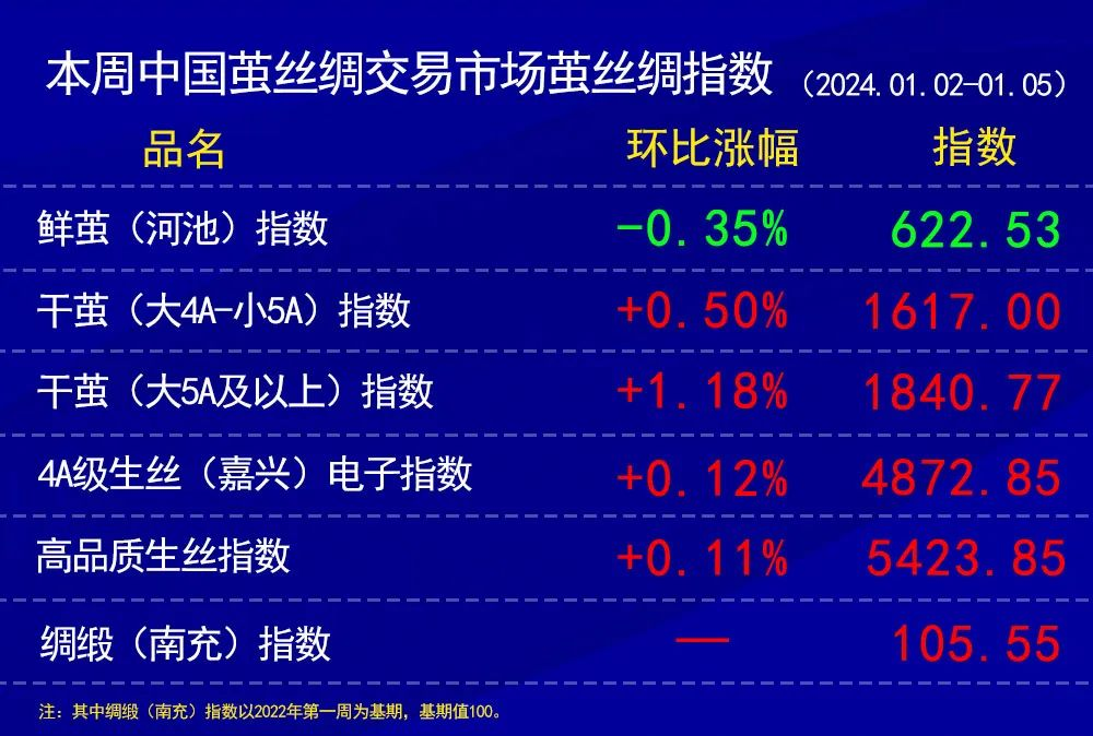 今日(2024年1月5日,周五)中國繭絲綢交易市場生絲指數(shù)微跌0.07%收于4872.85點,本周生絲指數(shù)上漲0.12%。B絲(商檢4A級生絲):240125合約下跌0.06萬元收于49.02萬元;240325合約下跌0.09萬元收于49.29萬元;240925合約下跌0.03萬元收于48.12萬元。