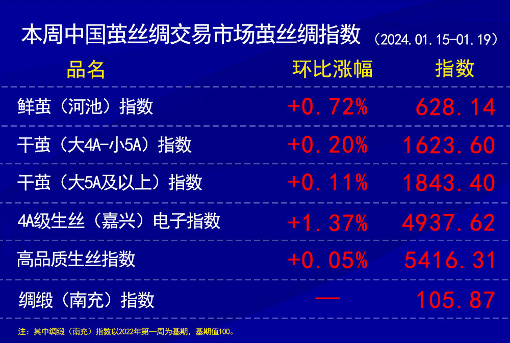 今日(2024年01月19日,周五)中國繭絲綢交易市場生絲指數(shù)上漲0.30%收于4937.62點,本周生絲指數(shù)上漲1.37%。B絲(商檢4A級生絲):240125合約上漲0.21萬元收于49.71萬元;240325合約上漲0.06萬元收于49.89萬元;240925合約上漲0.12萬元收于48.66萬元。