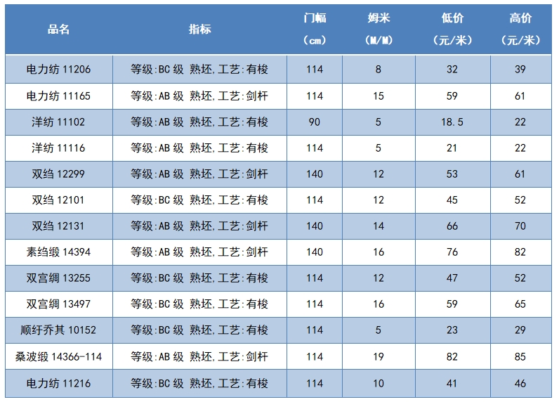 本周綢緞指數(shù)協(xié)作單位成交價(jià)格區(qū)間