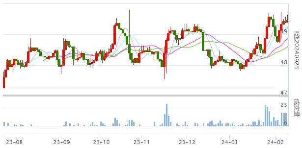 今日(2024年02月19日,周一)中國繭絲綢交易市場生絲指數(shù)上漲0.34%收于5083.50點。B絲(商檢4A級生絲):240325合約上漲0.12萬元報收于51.87萬元;240925合約上漲0.06萬元報收于49.47萬元;250325合約報平收于49.53萬元。