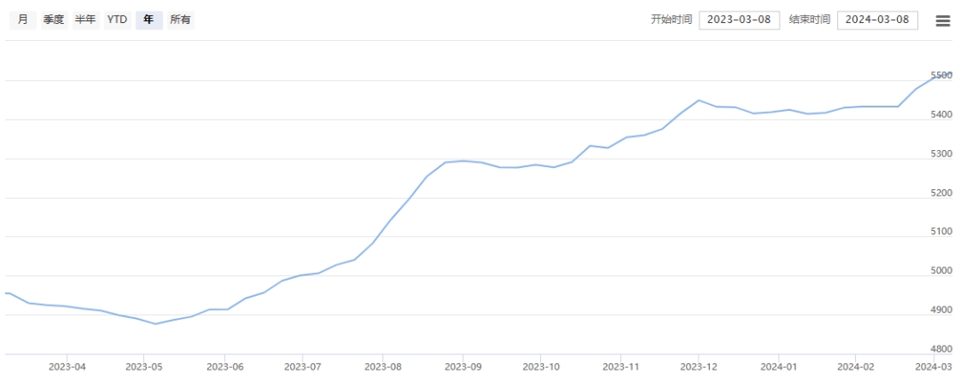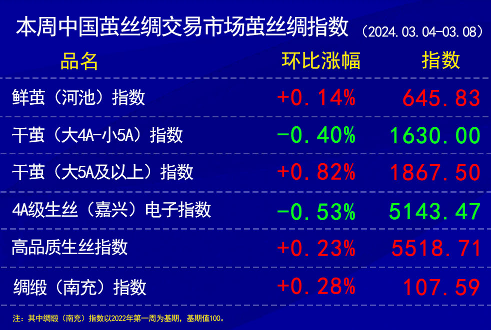 今日(2024年03月08日,周五)中國(guó)繭絲綢交易市場(chǎng)生絲指數(shù)持平收于5143.47點(diǎn),本周生絲指數(shù)下跌0.53%。B絲(商檢4A級(jí)生絲):240325合約上漲0.12萬(wàn)元報(bào)收于53.31萬(wàn)元;240925合約上漲0.03萬(wàn)元報(bào)收于49.62萬(wàn)元;250325合約下跌0.12萬(wàn)元報(bào)收于49.77萬(wàn)元。