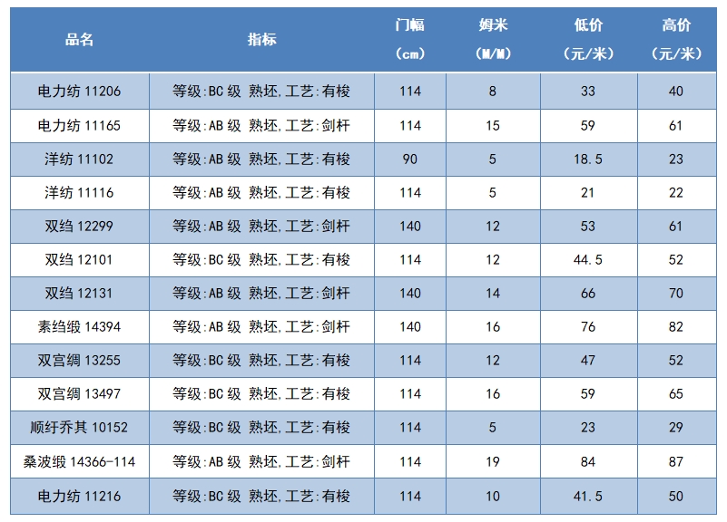 本周綢緞指數(shù)協(xié)作單位成交價(jià)格區(qū)間