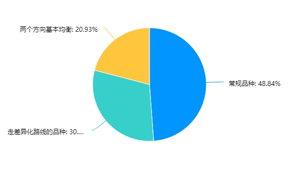 選擇走差異化路線的品種的為13家,占比為30.23%;