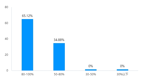 選擇30%以下的為0家;選擇30%-50%的為0家;選擇50%-80%的為15家,占比為34.88%;選擇80-100%的為28家,占比為65.12%。