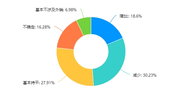 選擇增加的為8家,占比為18.60%;選擇減少的為13家,占比為30.23%;選擇持平的為12家,占比為 27.91%;選擇不確定的為7家,占比為16.28%;選擇基本不涉及外銷的為3家,占比為6.98%。