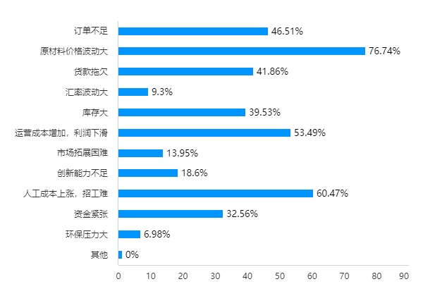 在回答可能影響今年企業(yè)經(jīng)營狀況的因素時,選擇原材料價格波動大的有33家,占比為76.74%,位列第一位。